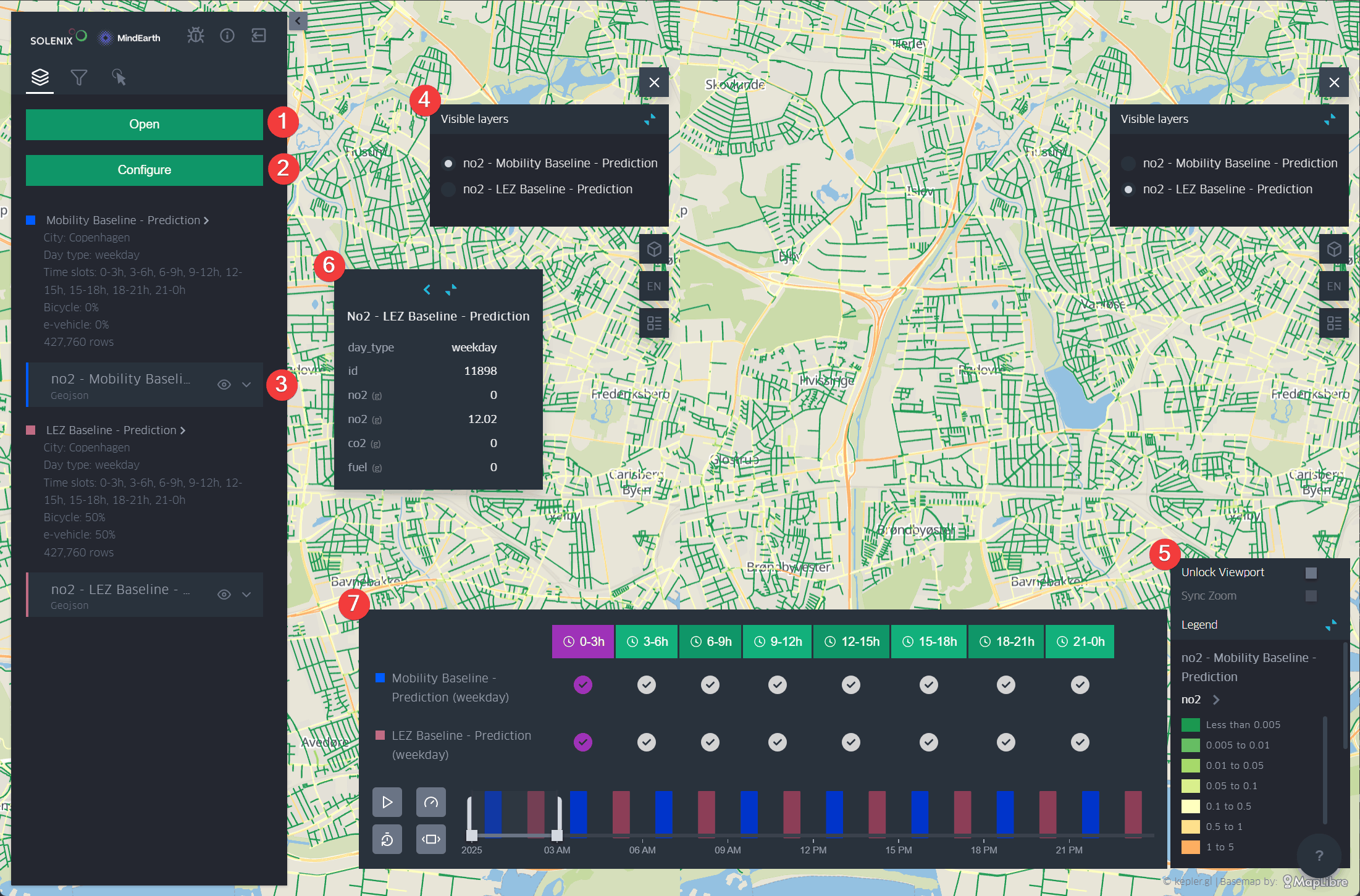 For example, the figure below shows a comparison of NO2 between the baseline and the LEZ Emission scenario in Copenhagen. Since there are several layers open, the user might scroll down through the legend to check the values for each layer. There is also the possibility to hover over the layers to see additional information. The user can display another scenario for comparison, and therefore explore the same layer under different simulations and urban contexts (e.g. compare CO2 levels in a baseline scenario vs high-speed road redesign).