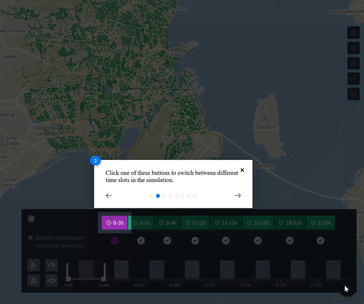 Additionally, it is possible to use the Filter tool to create dynamic animations as explained in figures previously. In this case, an example is shown of the parameters that can be set to create an animation of Road Occupancy. First, the user can activate the filter to only show the streets that are being occupied, therefore in hours with less traffic some streets will disappear of the map as there are no vehicles passing by. Then, using the time scale filter, the user can set the timeframes to be visualized in the animation. To ensure a smooth and continuous animation, it is recommended to set the playback button to cover a minimum timeframe of 3 hours (Figure 24).