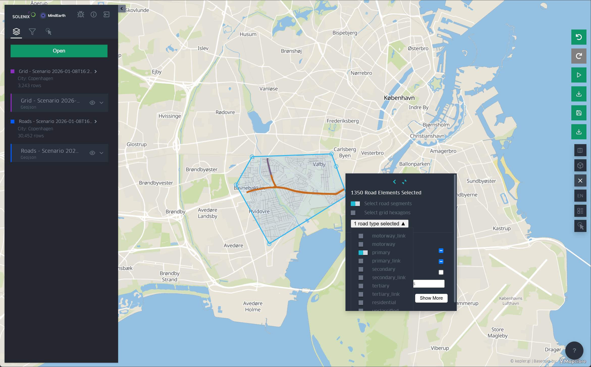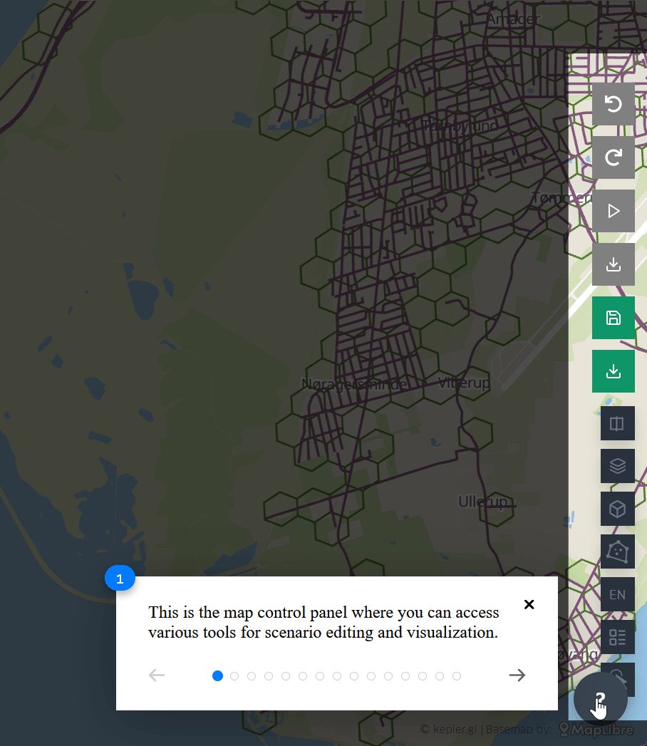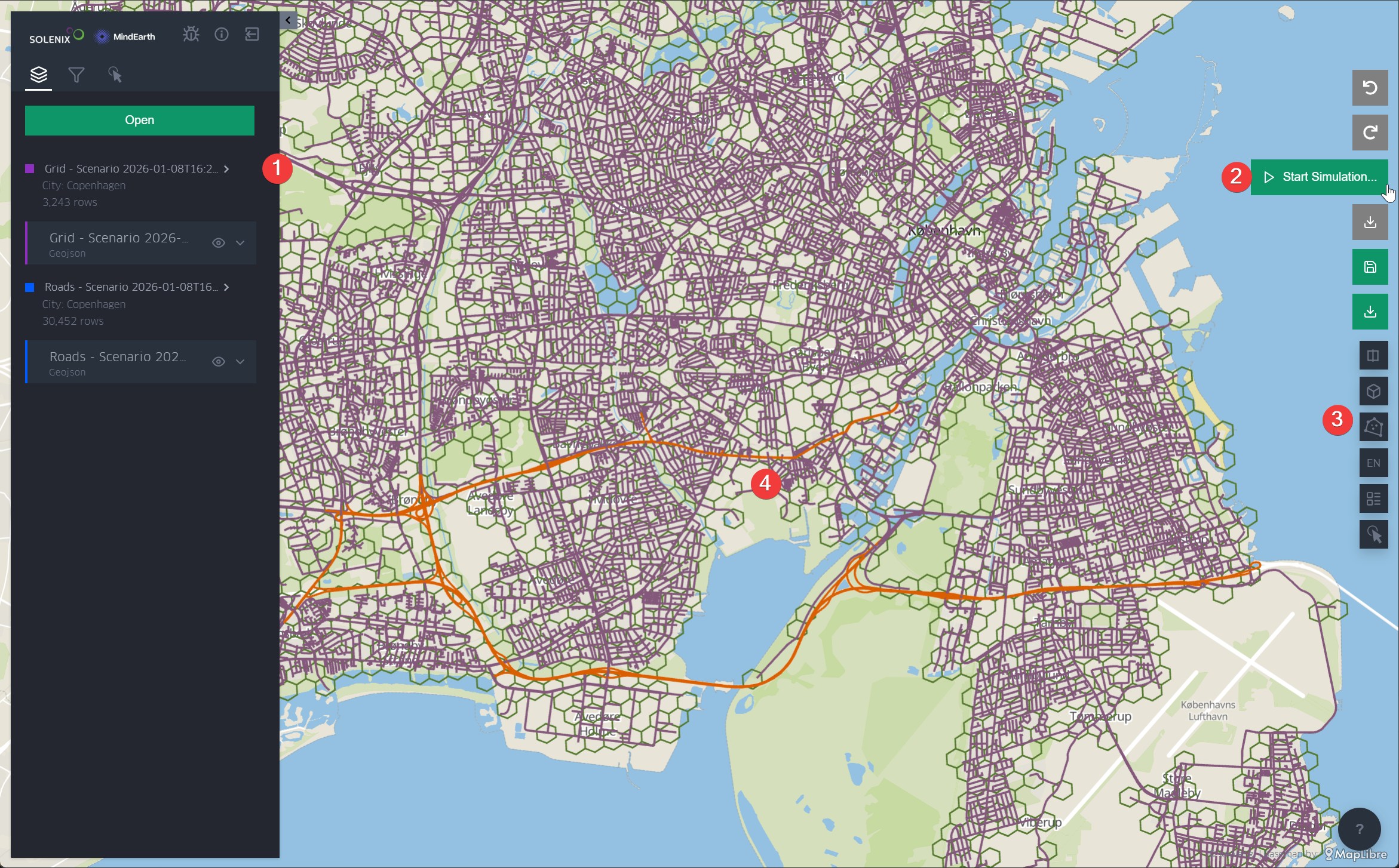 When loading a scenario, the map is populated with the scenario’s grid and road data and provides the user with several features to interact with and visualize the data.