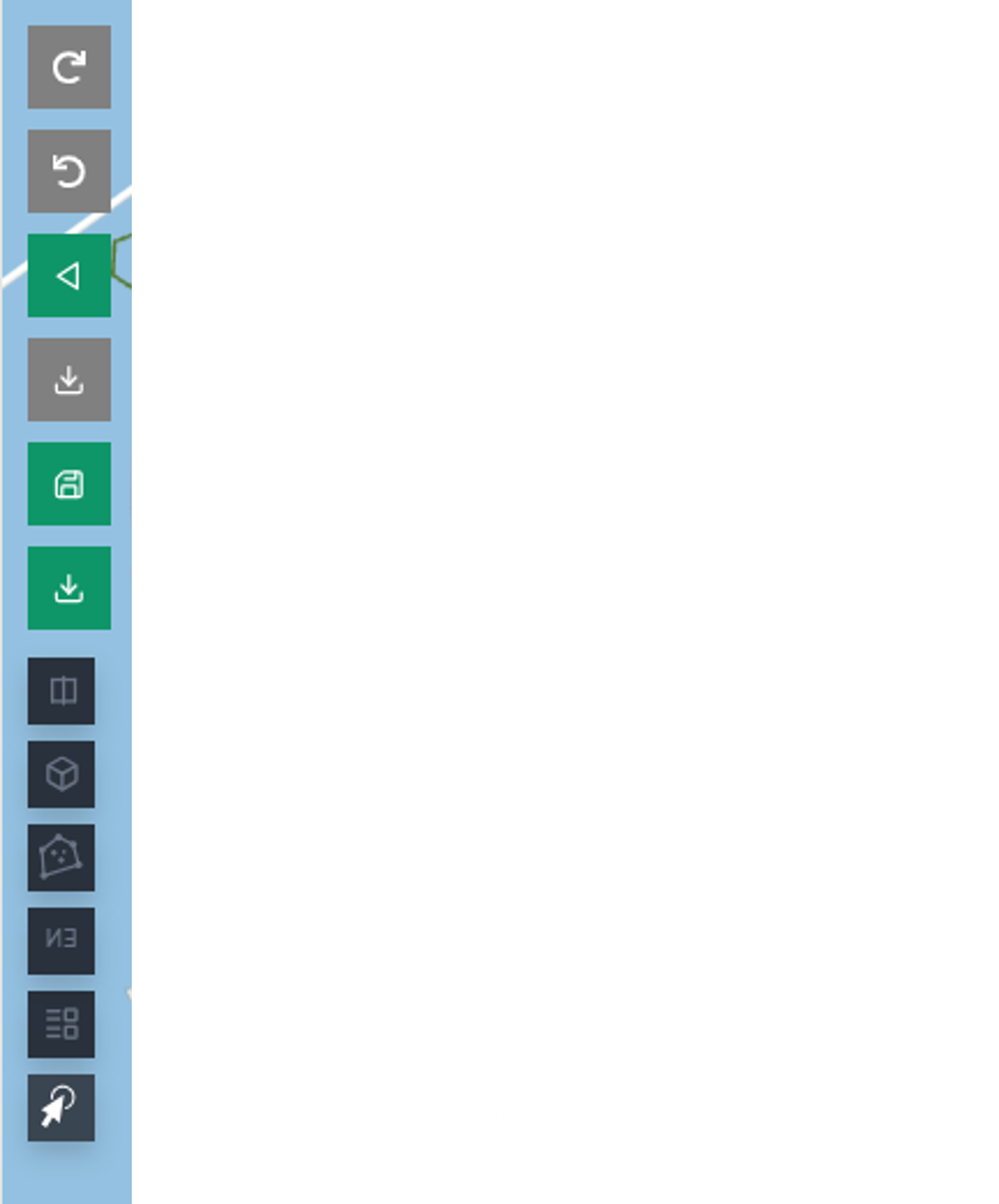 The buttons on the top of the screen allows the user to control their modifications to the loaded scenario, starting a simulation, saving or downloading their changes.