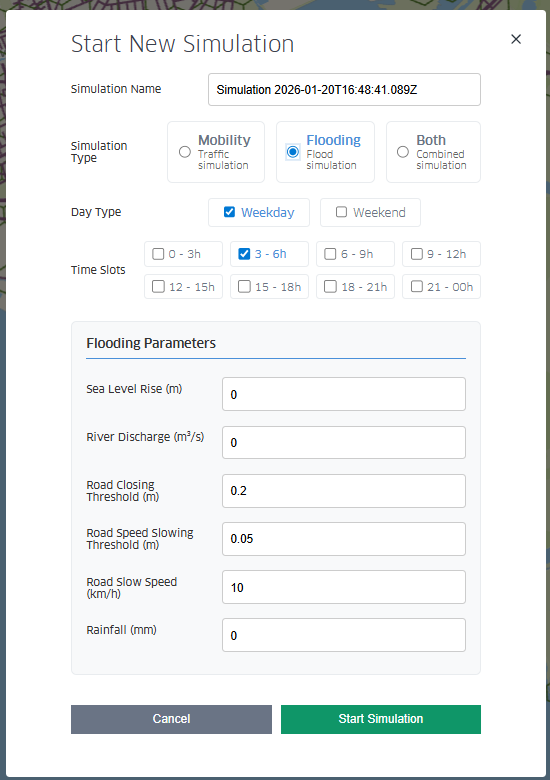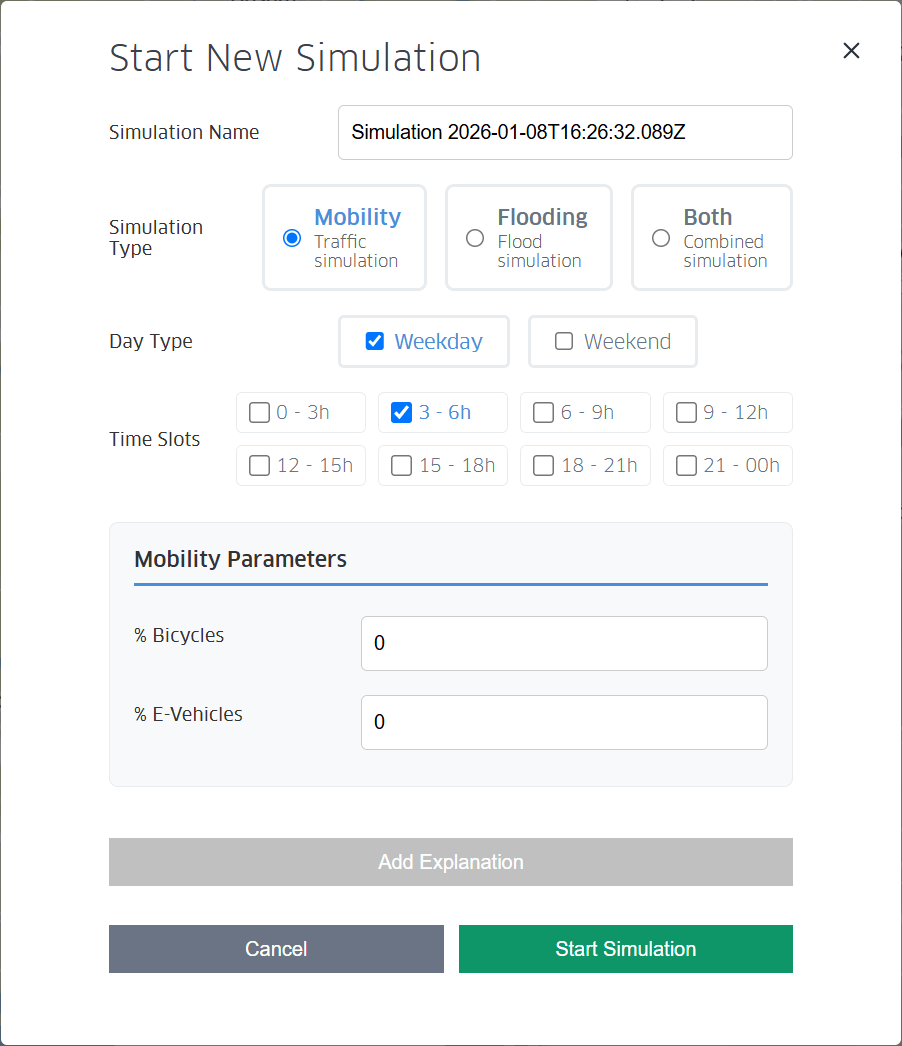 Changes to grid tile and road segment conditions along with scenario simulation parameters will have effects on the simulated air quality and mobility a patterns. For running a scenario simulation (Figure 18) the user needs to previously specify: