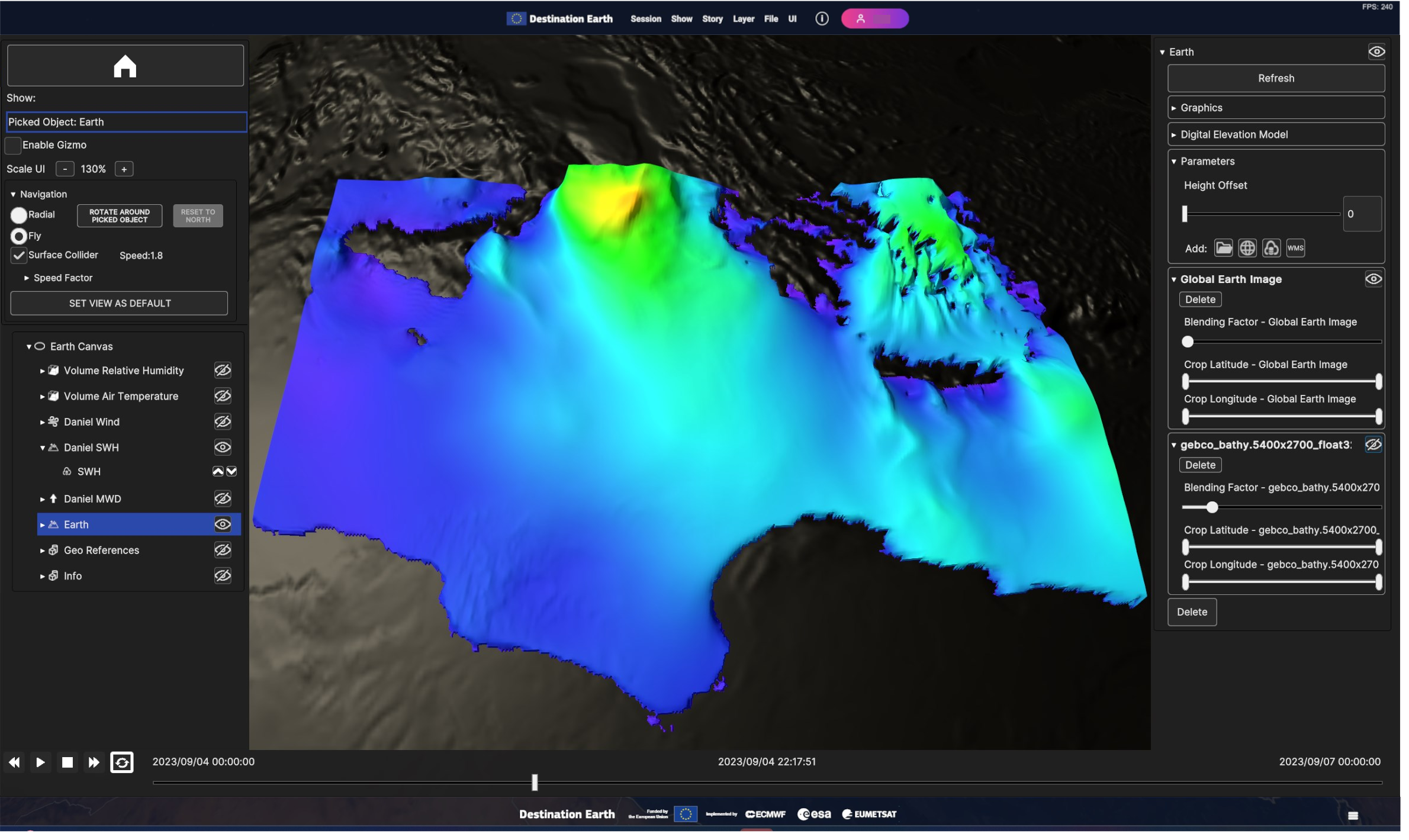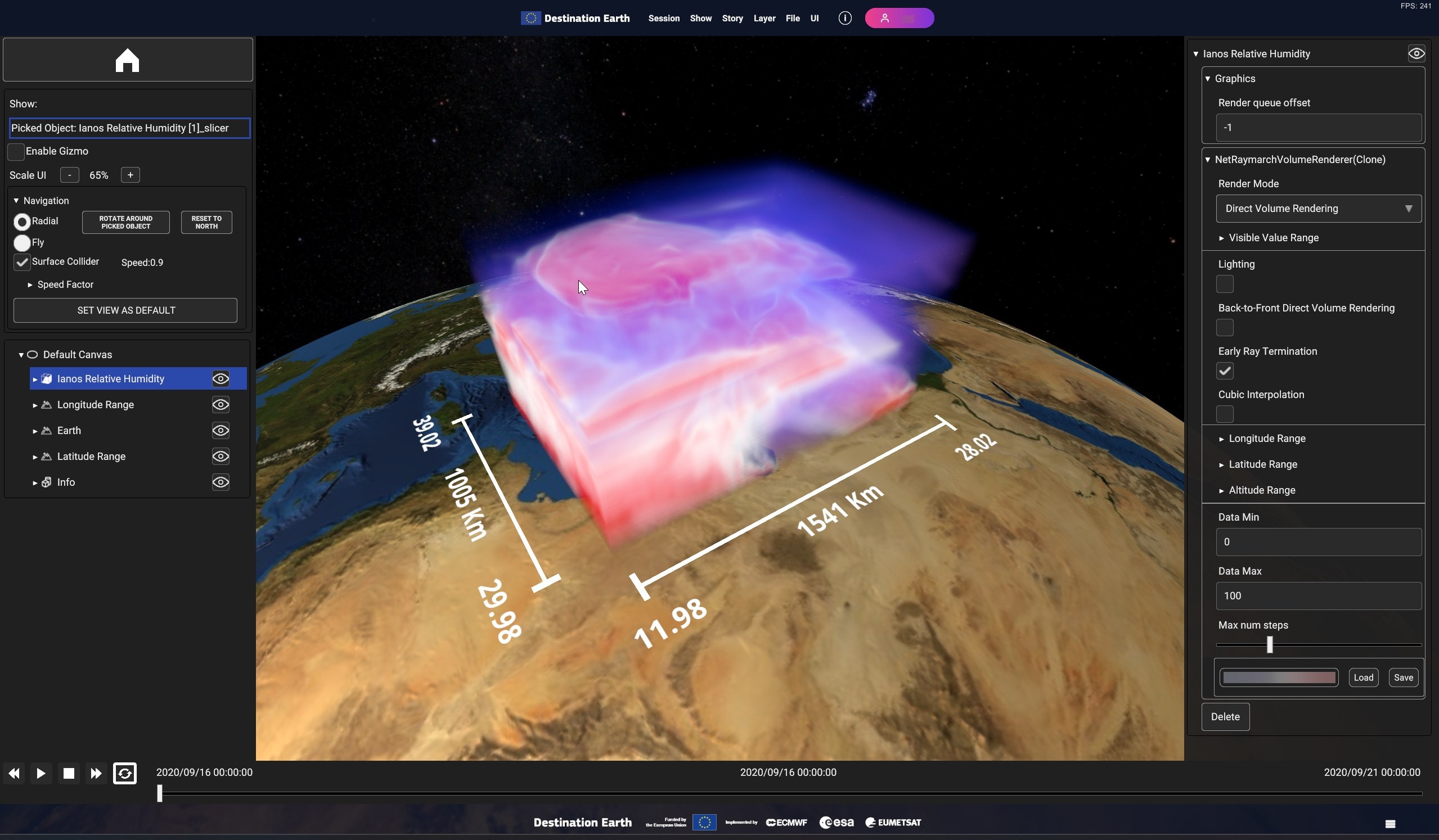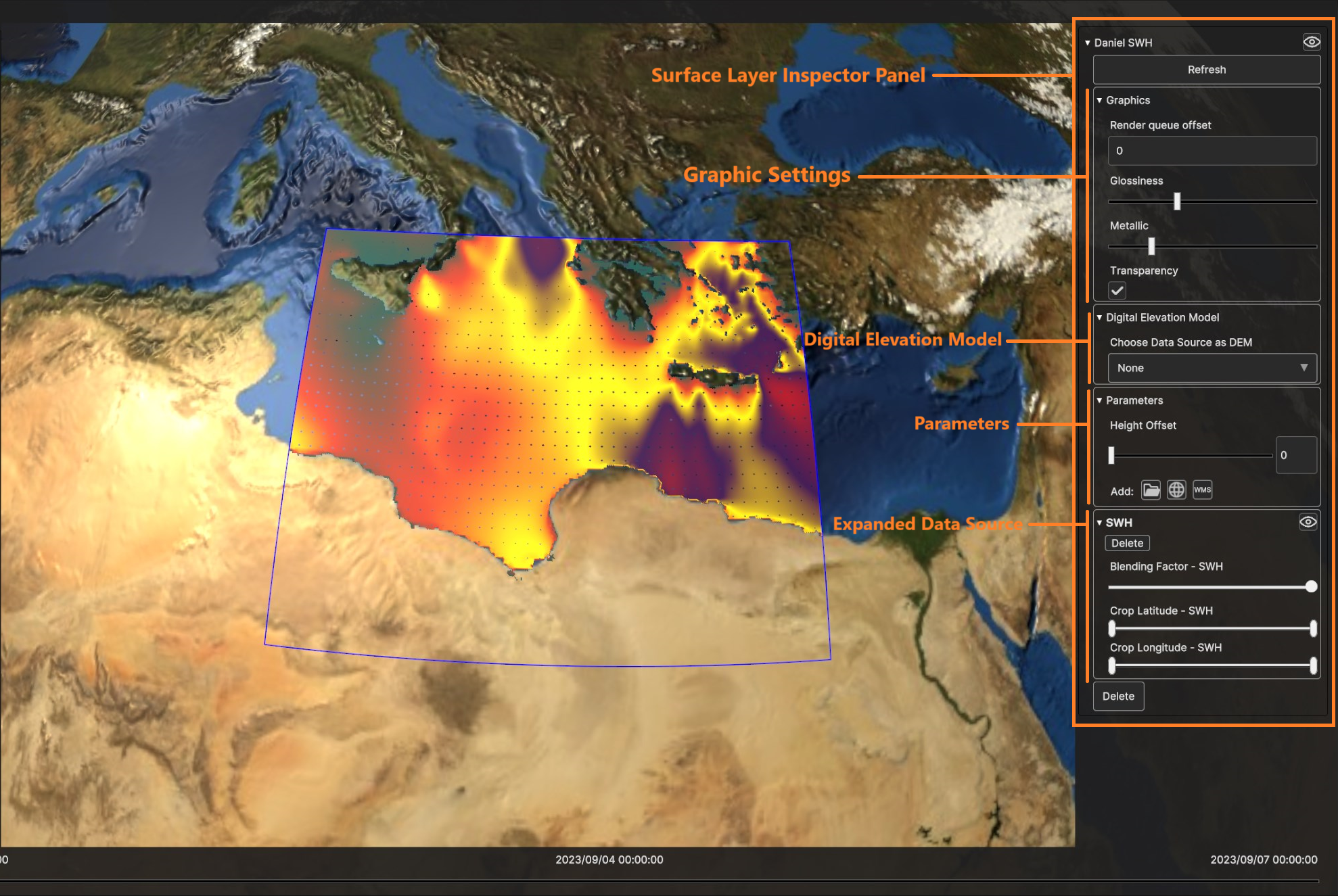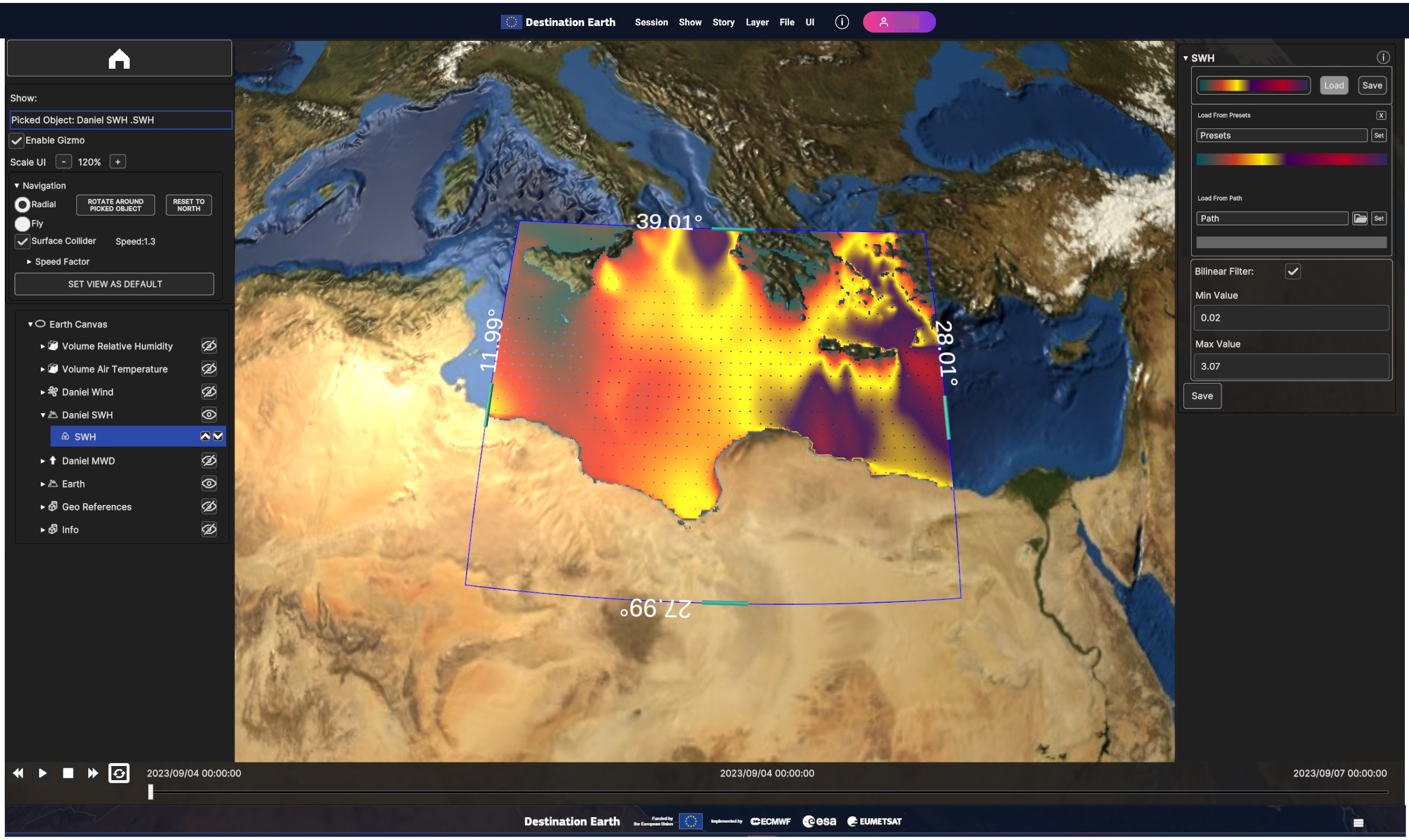 Using the timeline, user can navigate the dataset in time. Clicking on the layer card in the hierarchy tree shows the layer settings in the inspecor on the right.