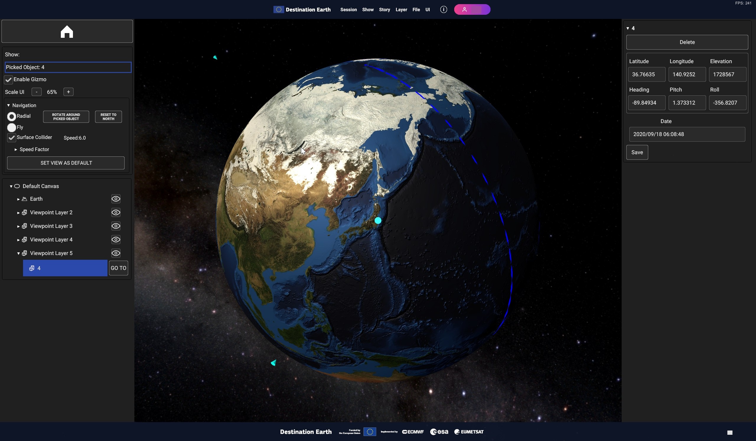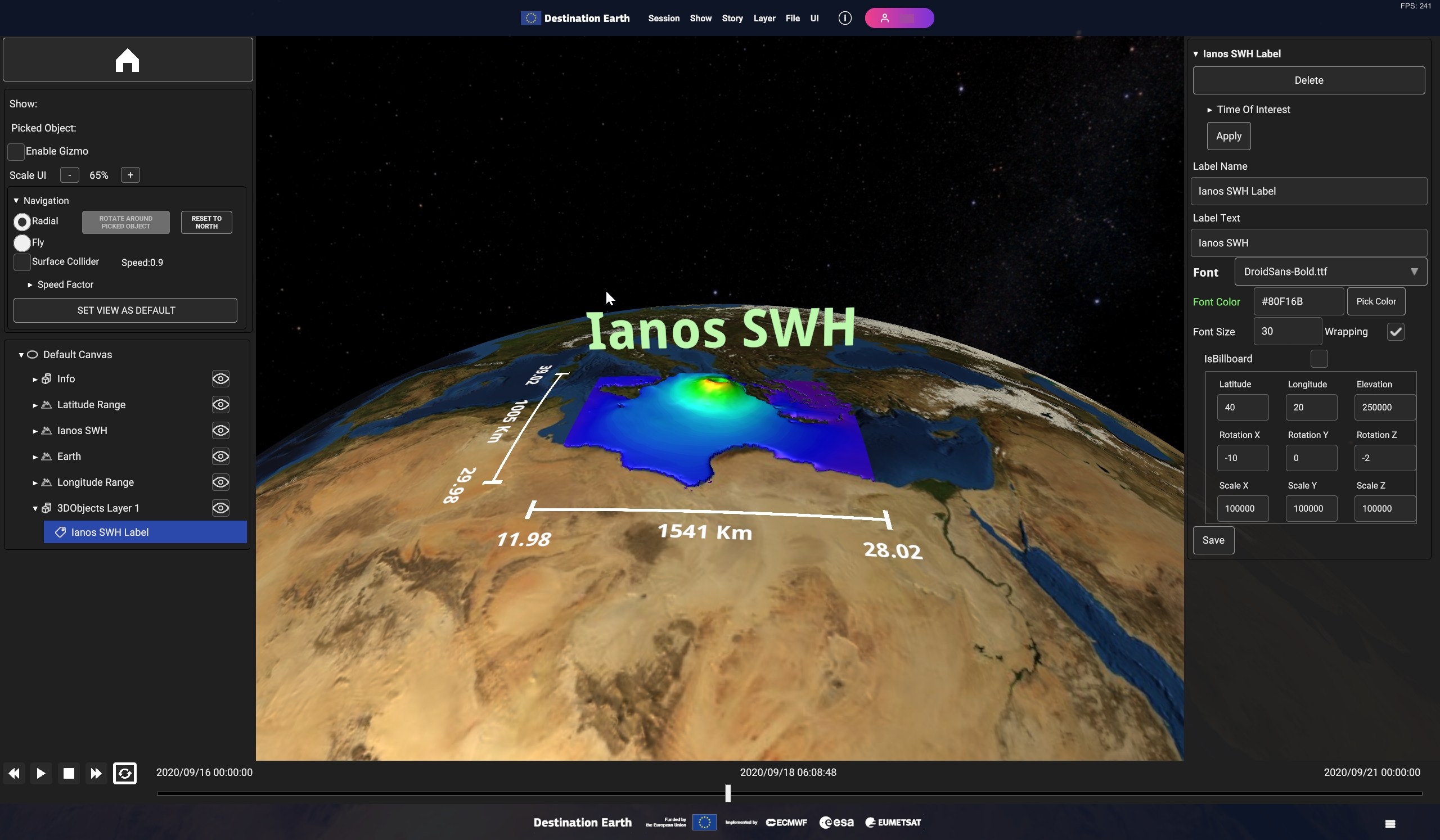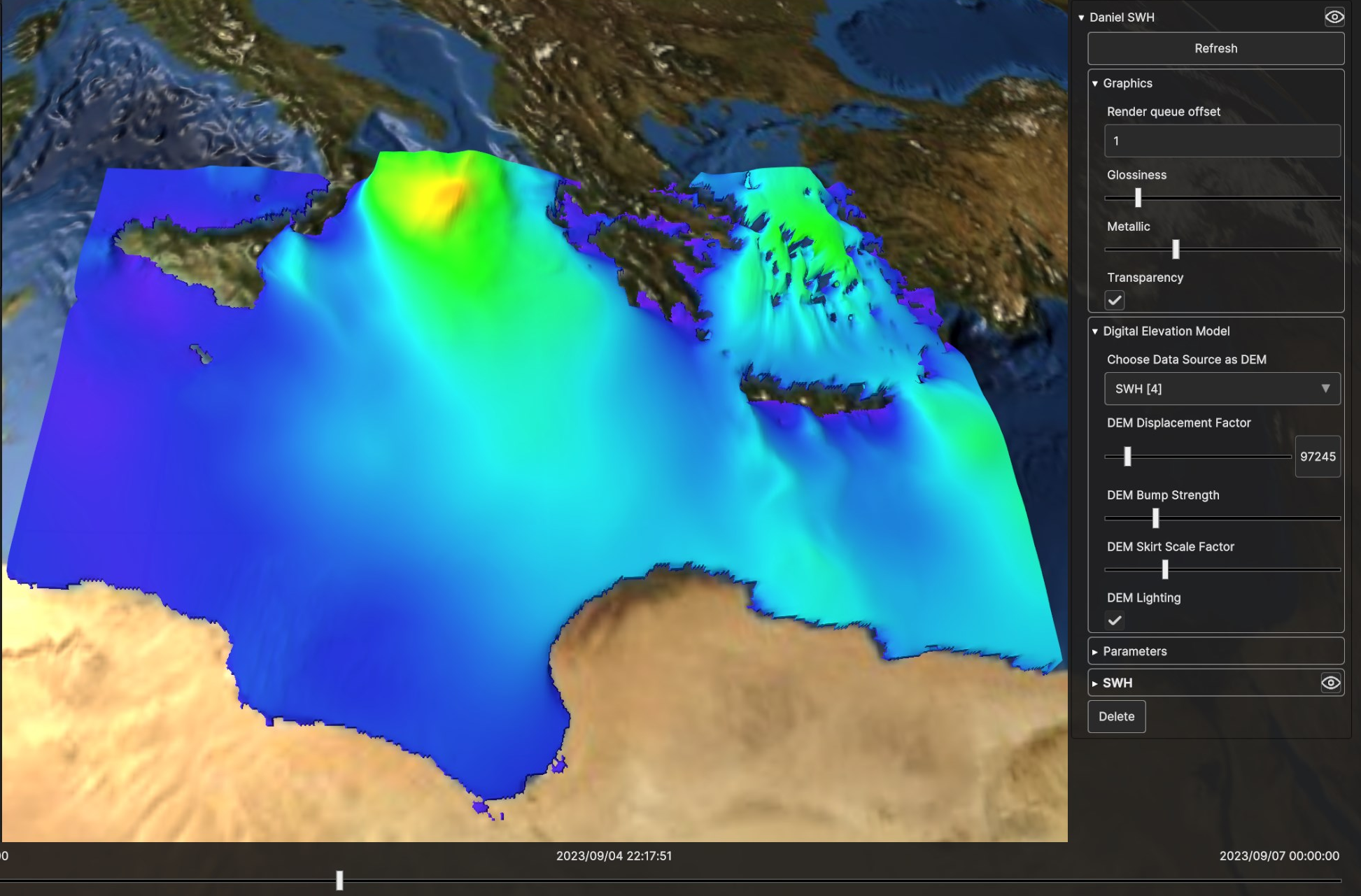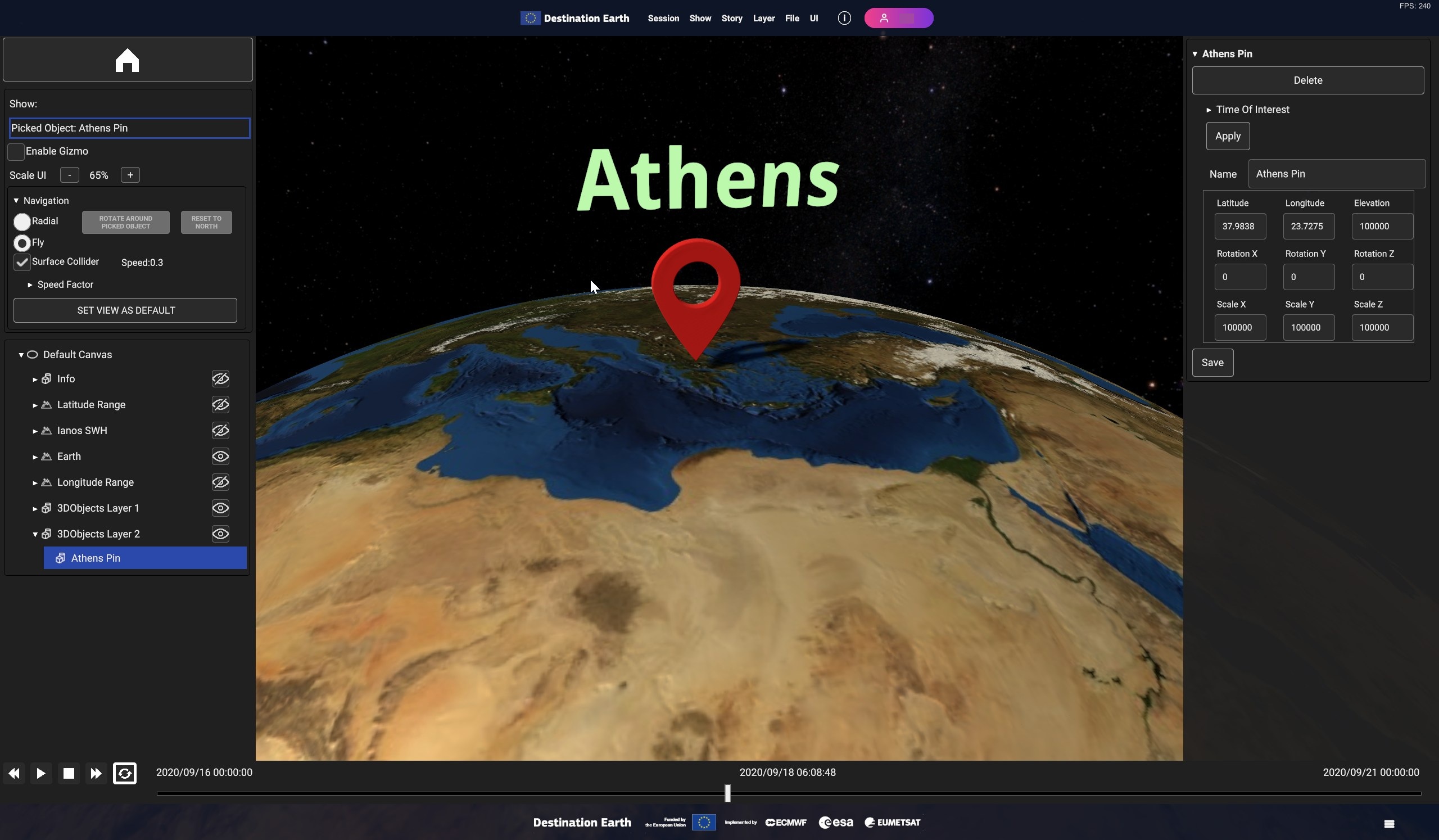Using the timeline, user can navigate the dataset in time. Clicking on the layer card in the hierarchy tree shows the layer settings in the inspecor on the right.