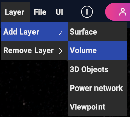 To add a volume layer, go to “Add Layer” > “Volume”. Then select a data source from local storage or from an external source. Refer to This Chapter > Data Sources for details.