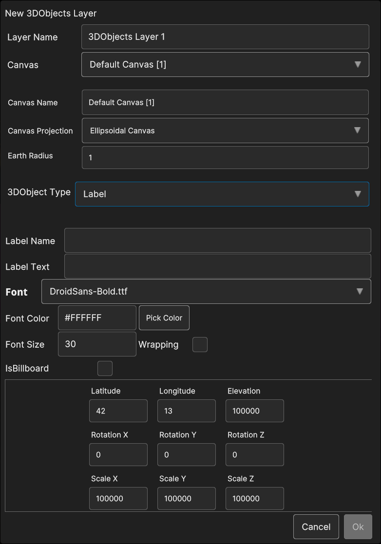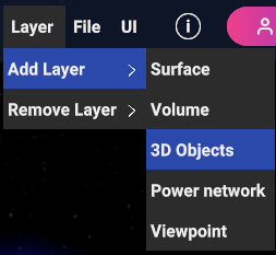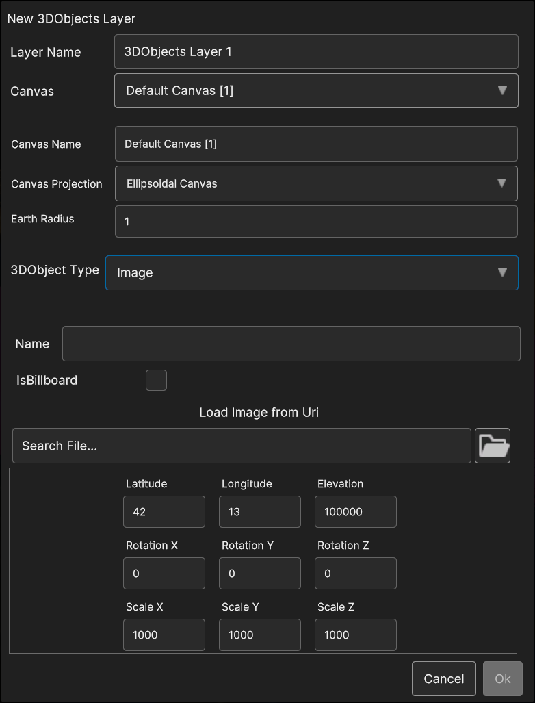 If 3D Objects menu item is selected, a popup appear in order to let the user choose the canvas type and the specific 3D Object data source that will be added to the layer.