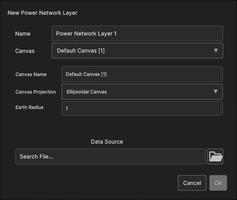 To add a power network layer, select “Power network” from the “Add Layer” menu. A popup like the one shown in Figure 4-45 is opened. To proceed the user must select a data source from the local file system. Once the data source it’s selected, the addition can be confirmed with the “Ok” button.