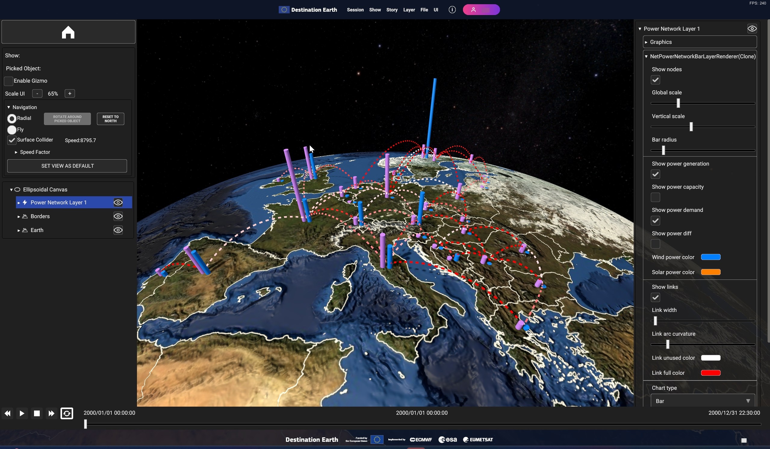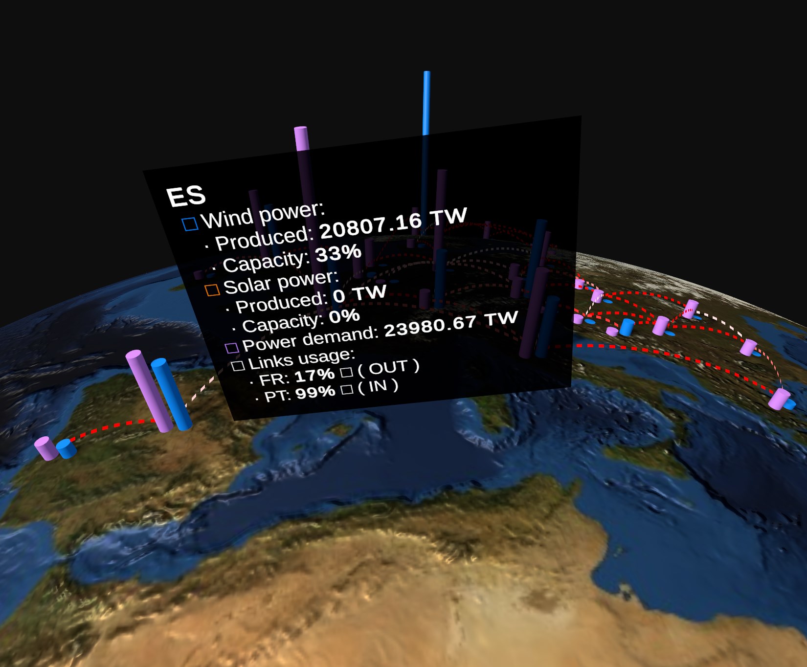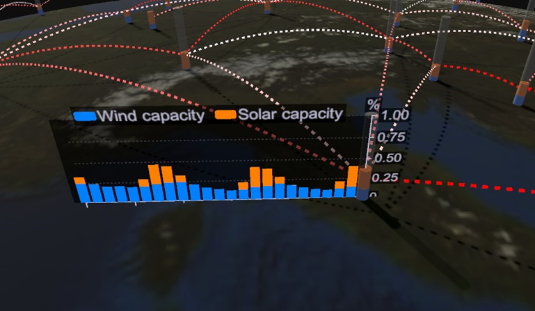 A power network layer displays a set of vertical bars for each of the nodes of the network, representing the value of the selected node variables (e.g. wind power generation, power demand etc) for the currently selected timestamp. The links between the nodes are animated and coloured basing on the power flowing between the nodes.