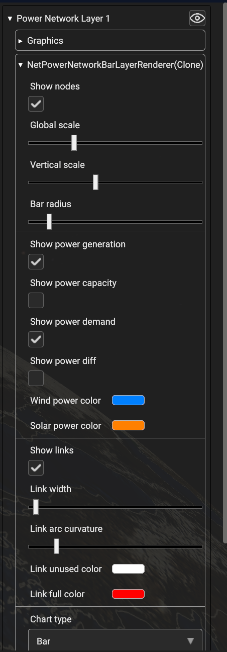 - • Vertical scale: Increase/decrease the height scale factor applied to the node bars.• Bar radius: Increase/decrease the radius of the node bars• Link width: Increase/decrease the line width used to display node links• Global scale: A global scale factor that applies to all of the above scale settings• Show nodes, “Show links”: Enable/Disable the visualization of the network nodes/links• Show power generation, Show power demand, Show power capacity, Show power diff: Select the variables to display in the node bars representation.• Chart type: Select the type of chart used for node series visualization. Available options are “Bar chart” and “Line chart”• Chart variable: Select the variable to display in the series chart. Available options are “Production”, “Capacity”, “Demand” and “Difference”