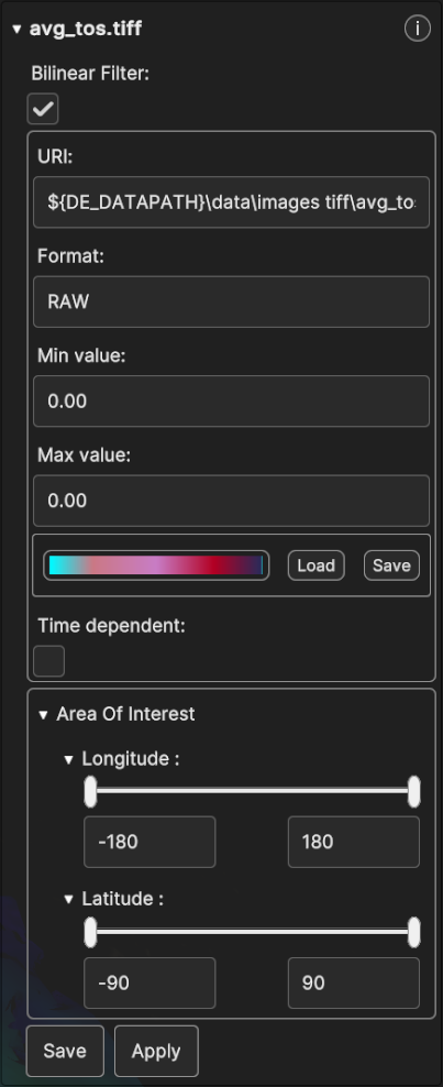 Longitude Range, Latitude Range and Altitude Range allow to slice the volume cube by moving the planes orthogonal to the Longitude, Latitude and Altitude dimensions.