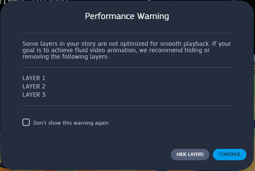 To reduce performance overload, before entering the present mode the application warns about any unoptimized layers for playback (see ch. Home Page, p. Timeline). It’s possible to hide them to improve performances.