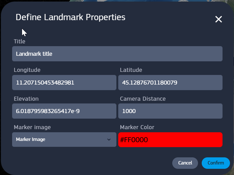- Landmark | A labelled pinpoint placed on the globe, marking a location. Added by picking a point on the globe.