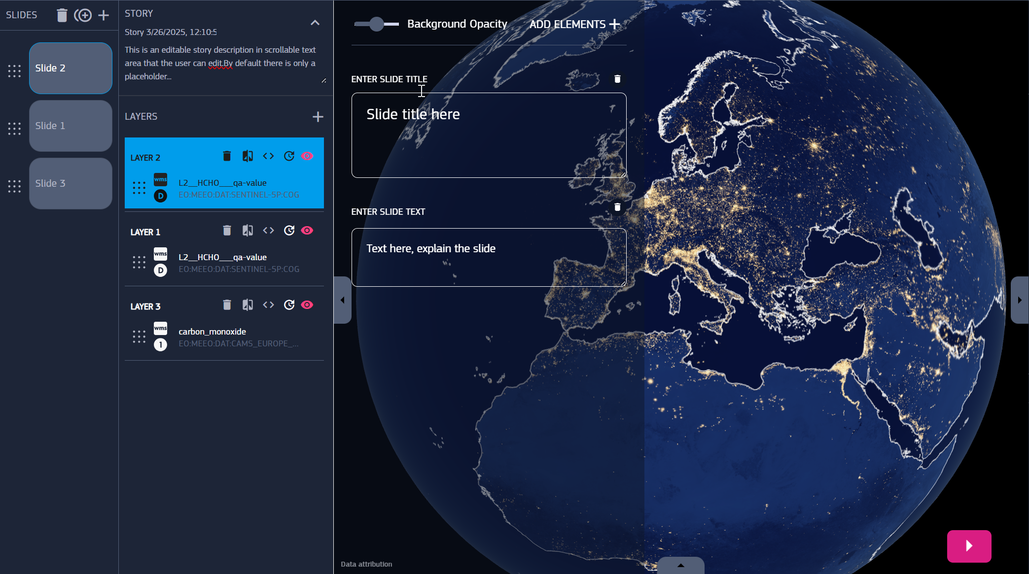 Slides feature multimedial content, similarly to presentation-type documents, to complement layers and enrich the story.