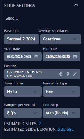 Each slide is played along its timeline from the set Start Date to the End Date, advancing by a time interval equal to Time step. Playback smoothness is determined by Samples per Second.