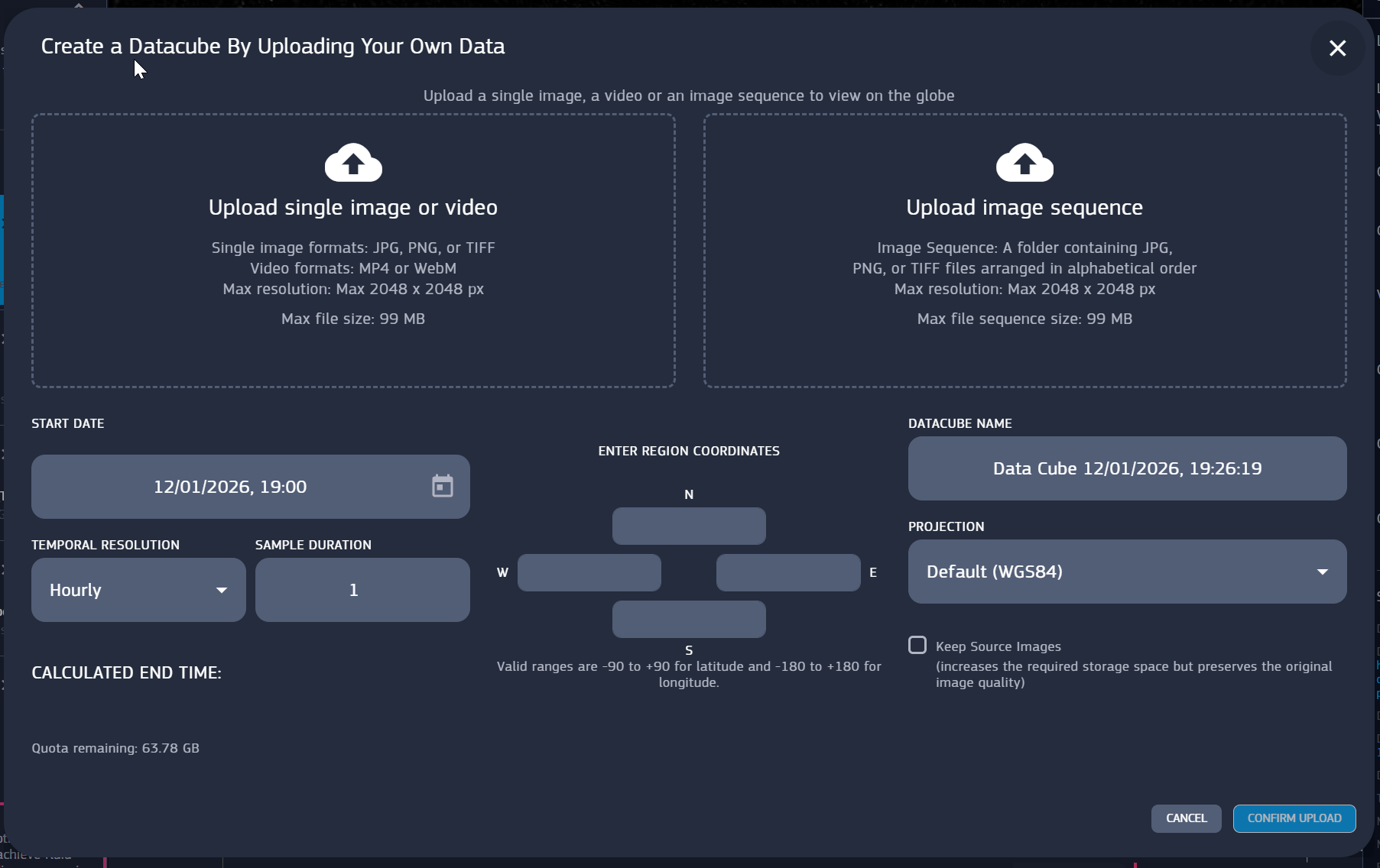 Data Offer provides an alternative way to create datacubes by selecting Upload your own data, which spawns a window to upload data from the local device. It’s possible to upload single images and videos, or multiple images, along with the parameters :